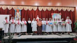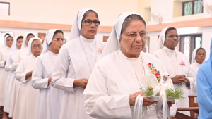 At 10.30 am, the Eucharist began escorting the celebrant Fr. Wilson SDB, Rector of D. Bosco College, T C Palaya by the dancers from Hassan. An introduction describing the one-month long practices as preparation for this important day. This was followed by M. Provincial carrying a dove symbol of peace, Councillors followed with lighted lamps. Mother Provincial placed the dove on the banana stem with the rays falling. The Animators carried a symbolic ‘tongue with the gifts and fruits of the Holy Spirit poked on the Banana stem. The youngest Sister of the Province too carried a dove and placed it at the foot of the stem. All the Animators received a dove symbol `as bearers of Peace.’ Prayers of the Faithful brought all the categories of the Province to the Lord.