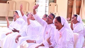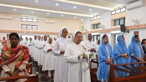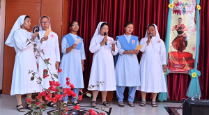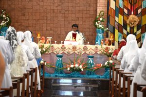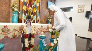 After the solemn Eucharist everyone gathered in front of the Sacred Heart of Jesus where Mother Provincial together with her Councillors cut the cake. Prayer Dance by Navajeevana children opened the felicitation programme followed by a beautiful welcome dance by the children of AWC. The felicitation prepared by the Vice Provincial Sr. Annie John was very creative that received great applause. Other programmes from the novices and Guduvanahalli children delighted everyone. The programme was wrapped up with the words of M. Provincial thanking everyone who contributed to its success especially Sr. Annie for the hard work and love she put in to animate this celebration and urged everyone to live the missionary spirit of St. Maria Troncatti. Sr. Vijaya Gudime delivered Vote of thanks after which all dispersed for a sumptuous meal prepared by our Sisters. Soon after lunch some of our Sisters and some Animators left for Bannerghatta to participate in the thanksgiving Eucharist celebrating the Platinum Jubilee of Profession of Sr. Anna Joseph and returned by 10pm. We thank the Lord for accompanying us all through the day.