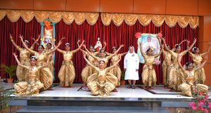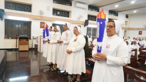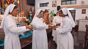 At 10.30 am, the Eucharist began escorting the celebrant Fr. Wilson SDB, Rector of D. Bosco College, T C Palaya by the dancers from Hassan. An introduction describing the one-month long practices as preparation for this important day. This was followed by M. Provincial carrying a dove symbol of peace, Councillors followed with lighted lamps. Mother Provincial placed the dove on the banana stem with the rays falling. The Animators carried a symbolic ‘tongue with the gifts and fruits of the Holy Spirit poked on the Banana stem. The youngest Sister of the Province too carried a dove and placed it at the foot of the stem. All the Animators received a dove symbol `as bearers of Peace.’ Prayers of the Faithful brought all the categories of the Province to the Lord.